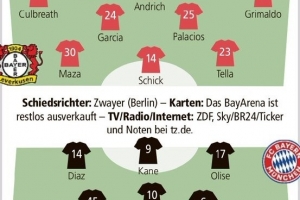 体育资讯4月22日讯 勒沃库森将在本轮德国杯半决赛坐镇主场迎战拜仁,《踢球者》预测了双方首发阵容。